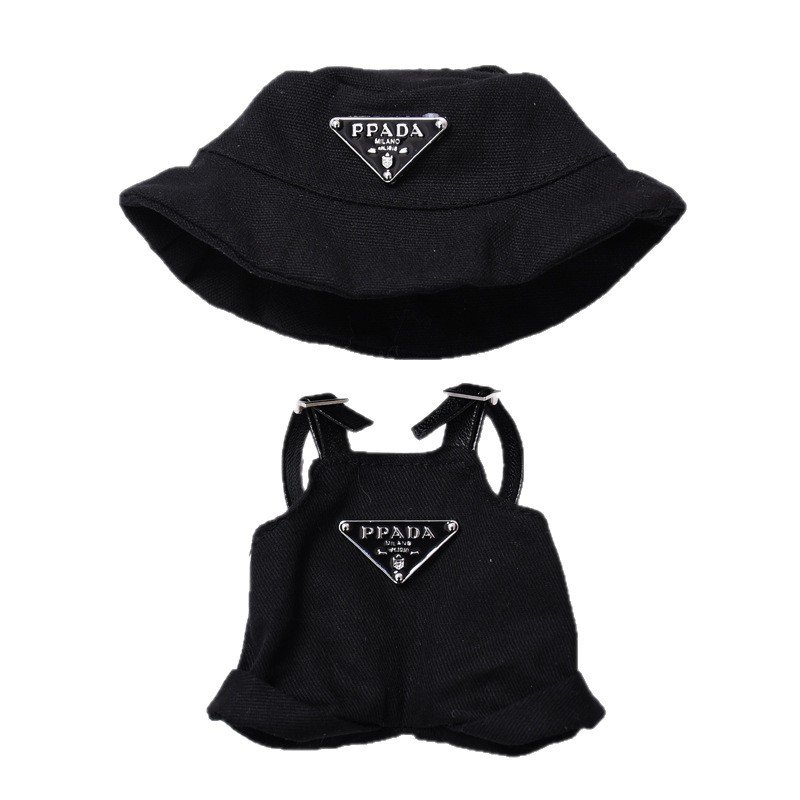 Style your 17cm Labubu doll in sleek fashion with this black luxury-inspired outfit set. Includes a trendy bucket hat and matching overalls, both featuring premium-looking logo accents for a designer touch. Perfect for collectors who want their dolls dressed to impress. Doll not included.